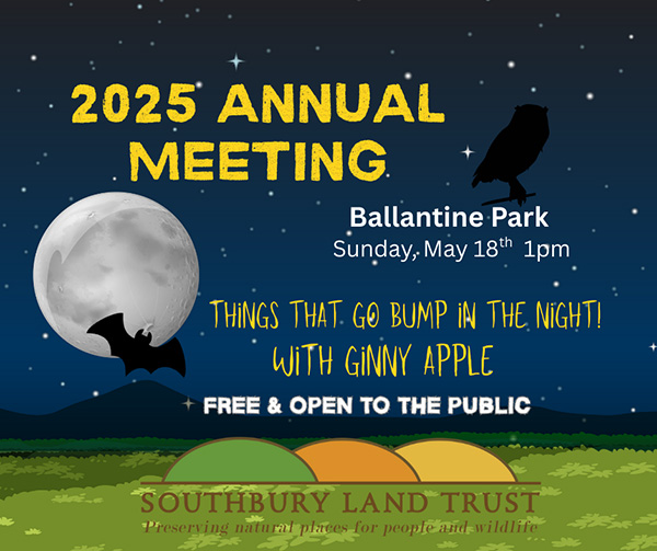 The Southbury Land Trust’s Annual Meeting is free and the public is invited. After a brief business meeting, the featured speaker is Master of Wildlife Conservationist Ginny Apple with the presentation, “Things That Go Bump in the Night.” Light refreshments will be served.