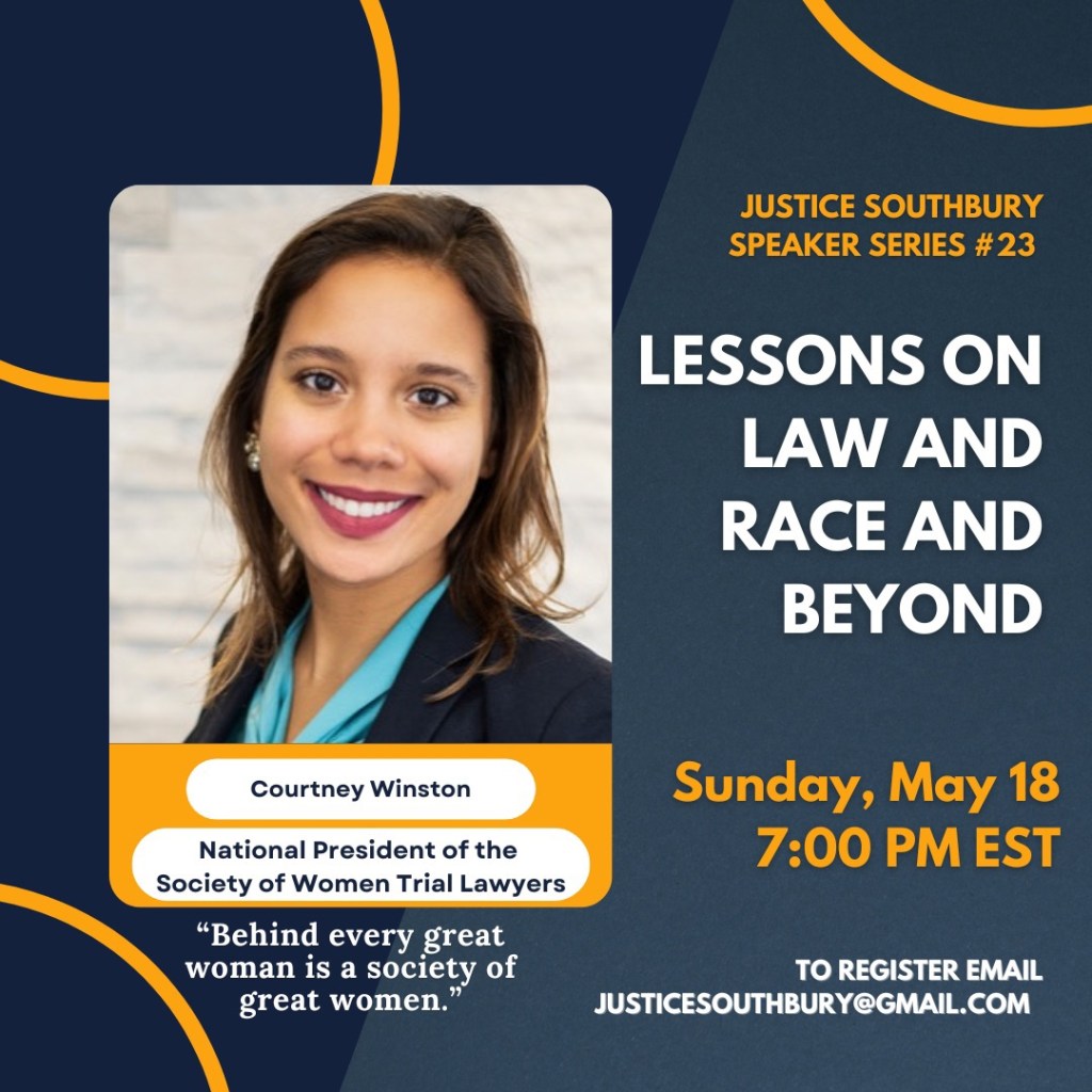 Justice Southbury will offer the twenty-third in its Speaker Series of interactive Zoom conversations. Courtney Winston, national President of the Society of Women Trial Lawyers, will discuss “Lessons on Law and Race and Beyond.”