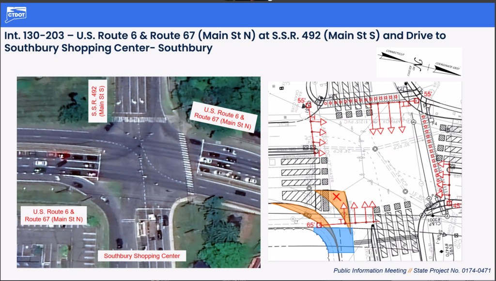 At the Main Street North/Main Street South intersection by the Southbury Shopping Center, CTDOT proposes removing the raised island in the right-turn lane.
