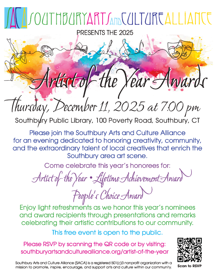 The Southbury Arts and Culture Alliance (SACA) will hold its 2025 Artist of the Year Awards Ceremony on Thursday, December 11, at 7:00 p.m. in the Kinglsey Room of the Southbury Public Library, 100 Poverty Road.