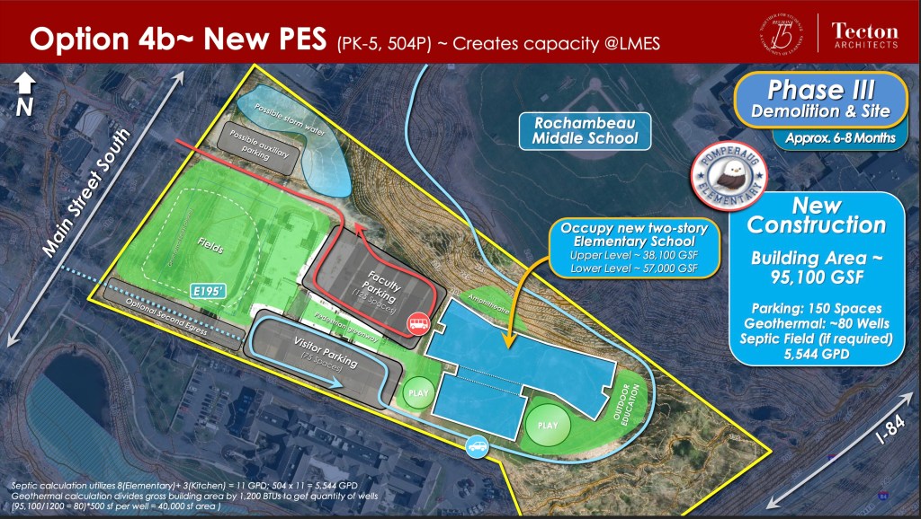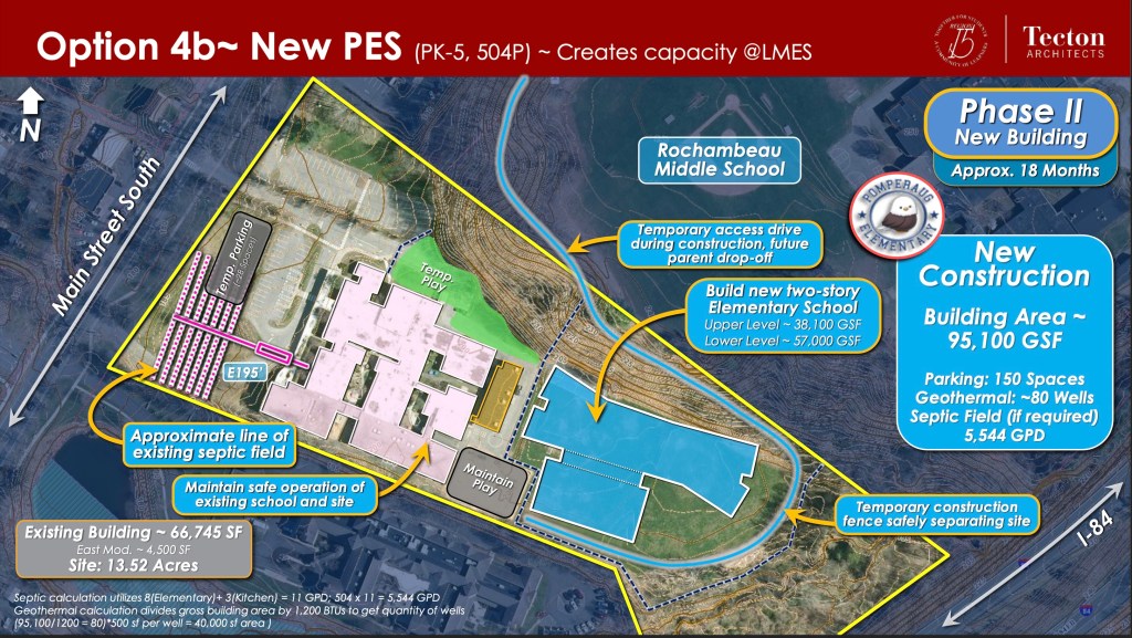 If PES remains at its current site at 607 Main Street South, plans call for the new two-story building to be constructed behind the existing school. A temporary access road from Rochambeau Middle School could potentially be built and later could be paved and converted into a permanent parent drop-off loop, accommodating around 80 queued vehicles and alleviating traffic backups.
