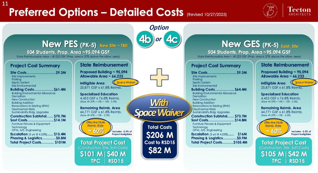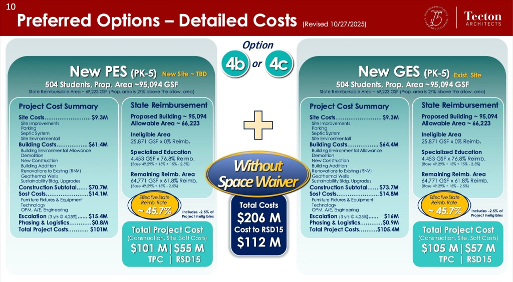 The proposed new elementary schools would each be about 95,000 square feet, roughly 27% larger than the state normally allows for reimbursement. If the district is granted a space waiver to account for this extra size, the total cost to taxpayers would be around $82 million, resulting in an effective state reimbursement of roughly 60%. Without the waiver, taxpayers would be responsible for about $112 million, with a reimbursement rate of 45.7%.
