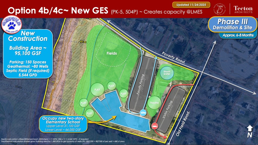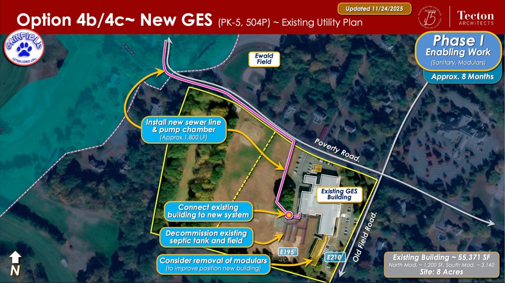 At GES, the district plans to install a new sewer line and pump chamber regardless of any school construction decisions. This would involve decommissioning the existing septic tank and field, and would not be reimbursable.