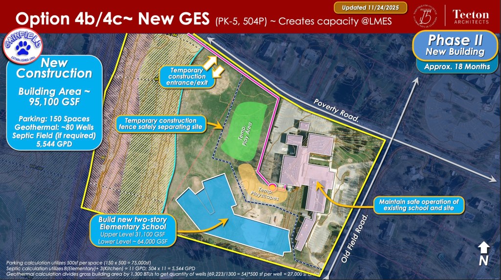The remaining two options include building two new schools on their existing property, or building a new GES on its current site while finding a new site for a new PES building.
