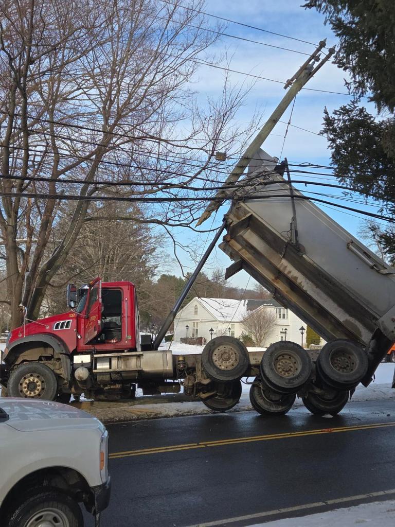 As the truck’s dump bed was extended upwards, it snagged wires and snapped the utility pole in half, while also obliterating a Frontier fiber line, affecting people along Main Street North between Pine Hill Road and Old Field Hill Road.