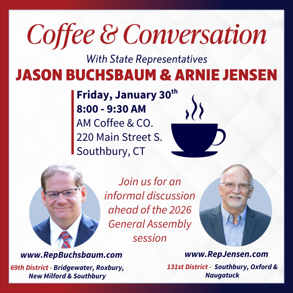 Buchsbaum will be joined at the Southbury event on Friday, Jan. 30, by State Rep. Arnie Jensen (R-131), who represents portions of Southbury, Naugatuck, and Oxford.
