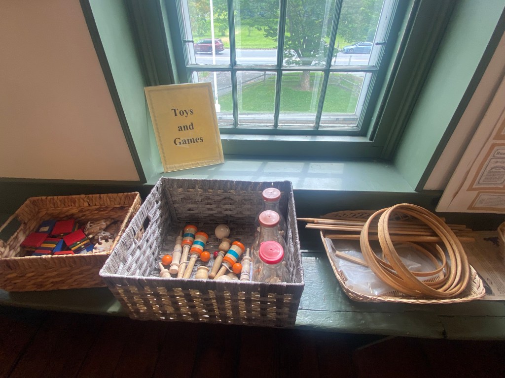A bin full of 1850s-era toys and games, including a ball-and-cup game also known as “bibloquet”, sits on the second floor of the schoolhouse, awaiting students to experience what recess was like in that time period.