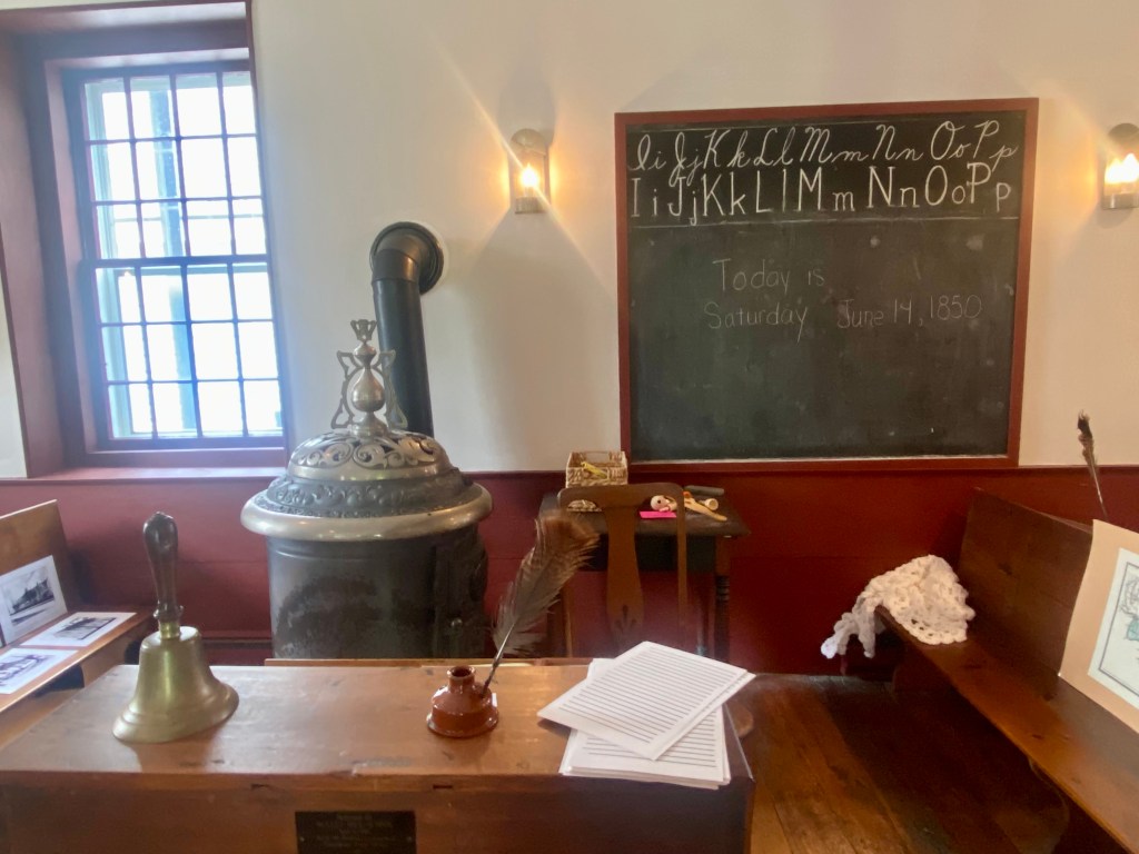 Elementary school students – mainly second and third grade classes – arrive by bus at the small brick schoolhouse and are greeted by a costumed docent, ready to begin a school day set in the 1850s.