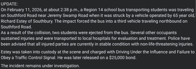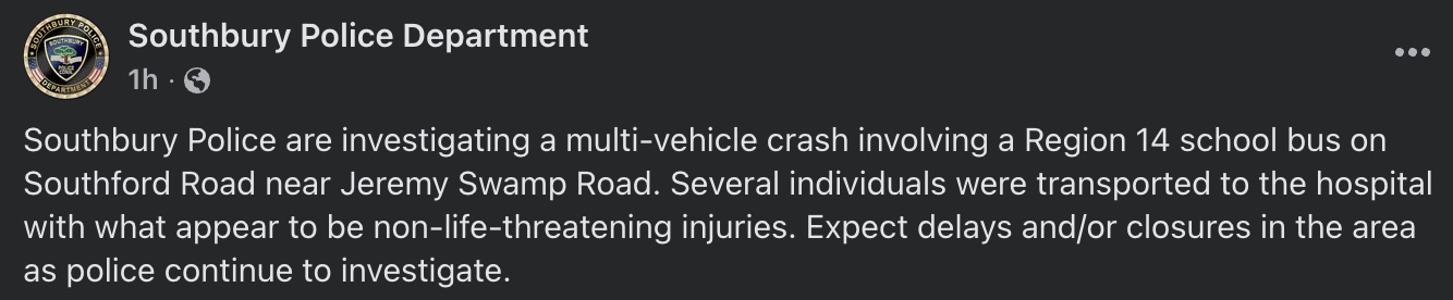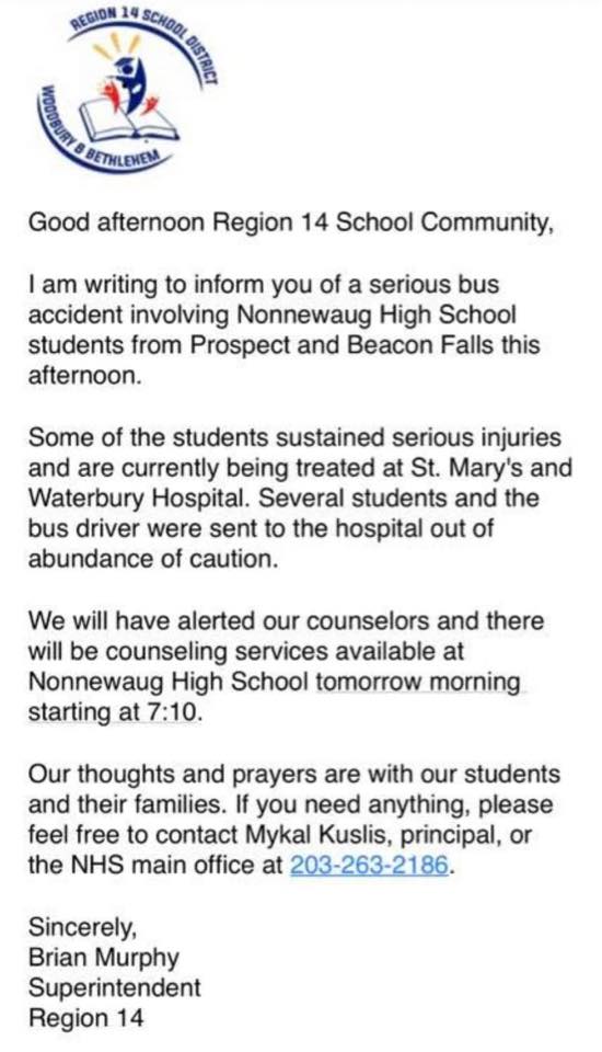 The Region 14 school district released correspondence to families saying in part: “Some of the students sustained serious injuries and are currently being treated at St. Mary’s and Waterbury Hospital. Several students and the bus driver were sent to the hospital out of precaution.”