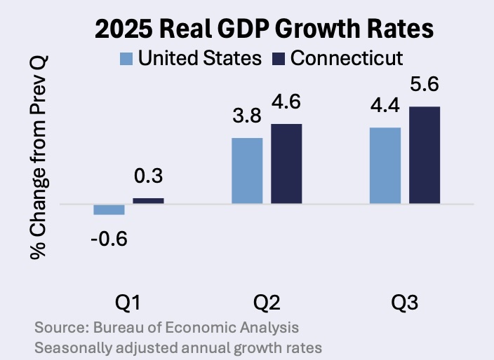 Data from the Bureau of Economic Analysis shows that Connecticut’s Gross Domestic Product (GDP) grew faster than the nation overall for the first three quarters of 2025. The state’s second quarter GDP growth of 4.6 percent in 2025 ranked ninth among the 50 states.